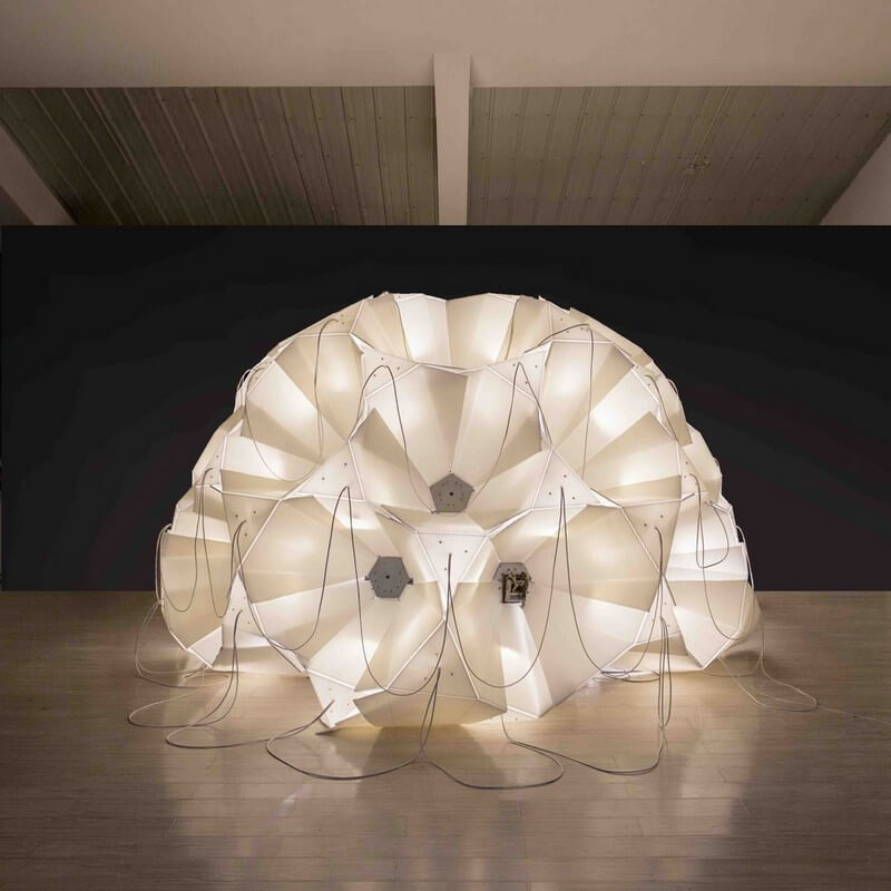 Each camera is attached to a node of the Hoberman-inspired, isokinetic structure. With minimal adjustment, the 3D Copypod can contract to scan small objects and expand large enough to scan a group of people. Folding panels that are lit from the interior enclose the structure of the 3D Copypod to ensure a shadowless photography environment.