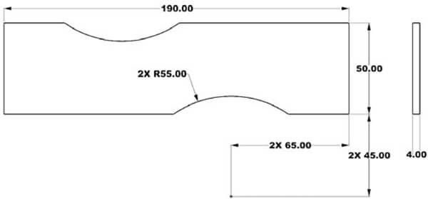 During this study, a lot of tensile tests are performed for different geometries such as ASTM-D638 type 1, rectangular geometries, rectangular geometries with holes, etc. Geometries are randomly chosen to prove the applicability of the method.