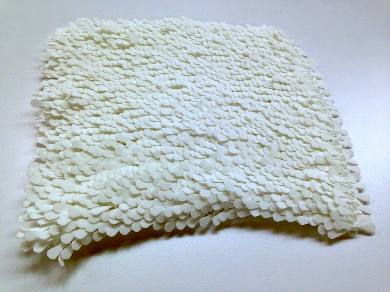 Designed by 3D print service Digits2Widgets as a means to demonstrate the possibilities of 3D printing, the “fabric” is quite flexible. So flexible it’s almost comfortable against your skin. It’s like cloth, as it droops when lifted. It’s composed of zillions of tiny interlocked pieces, some offering “shields” for the “exterior surface”. This is in spite of the fact that each individual piece is made from hard, 3D printed SLS nylon material. These 3D print samples are quite unlike other flexible items we’ve seen. Other items may be flexible because they offer a couple of joints, while others are made with rubbery material. These are neither. The material has a delicate, light feel that almost seems warm. The material even has a pleasant soft sound when it’s flexed.