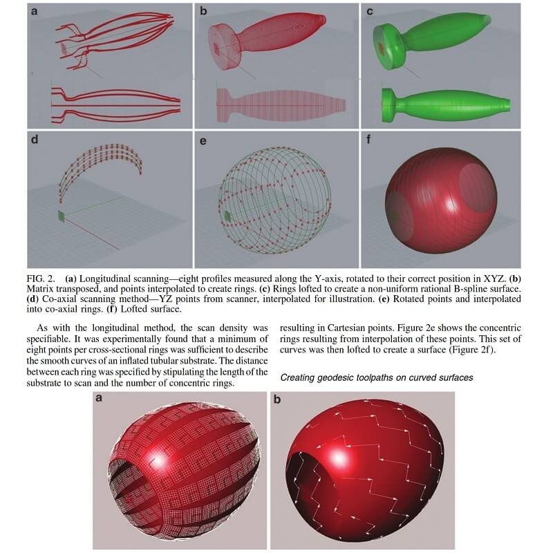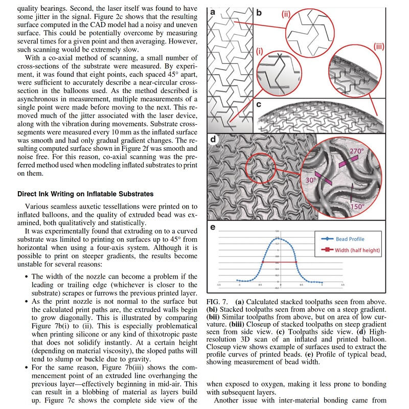 This article by Fergal B. Coulter, Brian S. Coulter, Emmanouil Papastavrou and Anton Ianakiev, is describing a process for conformal 3D printing onto inflated substrates. The article describes the design and build of a custom-built four-axis 3D printer with the ability to measure the shape of any uneven substrate, and to then accurately extrude a thixotropic silicone onto the substrate by using Direct Ink Writing techniques.