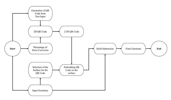 The steps of integrating the QR code on the 3D printed parts include generating the QR code representing the information, generation of the CAD model, and embedding the CAD model of the QR code on the appropriate surface of the artifact. Once the conventional design and fabrication pipeline of 3D printers is followed, QR codes embedded on the interior surfaces would be lost. That’s why we developed an automated approach utilizing algorithmic tools for CAD software.