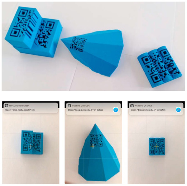 Since we are using the interior surfaces, the outer surface or the shape of the object is not affected by the QR code patterns. We used Rhinoceros3D (CAD software) and Grasshopper3D (analytical modeling tool for Rhinoceros3D) environments for the realization of the proposed method. We fabricated several parts with QR codes in them utilizing a Fused Filament Fabrication type of 3D printer and showed that the codes are readable via the cameras of the mobile phones. We concluded the paper with proposing some application areas of the method.