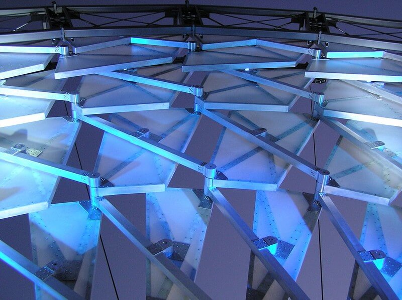 The arch was designed by Chuck Hoberman to be used as a mechanical curtain for the Olympic Medal Plaza’s stage. It is a semi-circular aluminum structure, which opened like the iris of a human eye. The arch design was inspired by Utah’s natural stone arches, such as Delicate Arch. At the time of its construction the arch was the largest unfolding structure in the world.