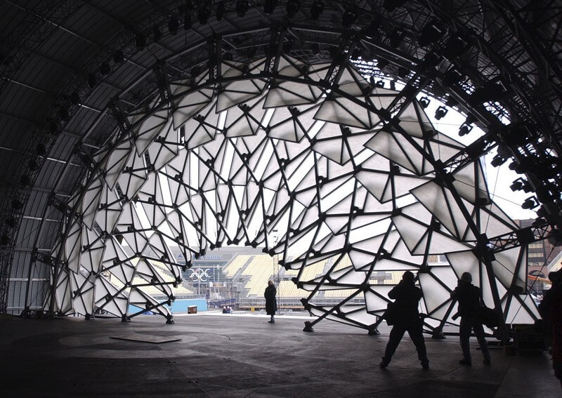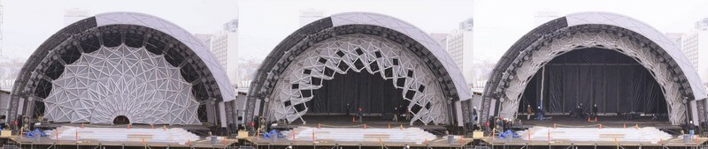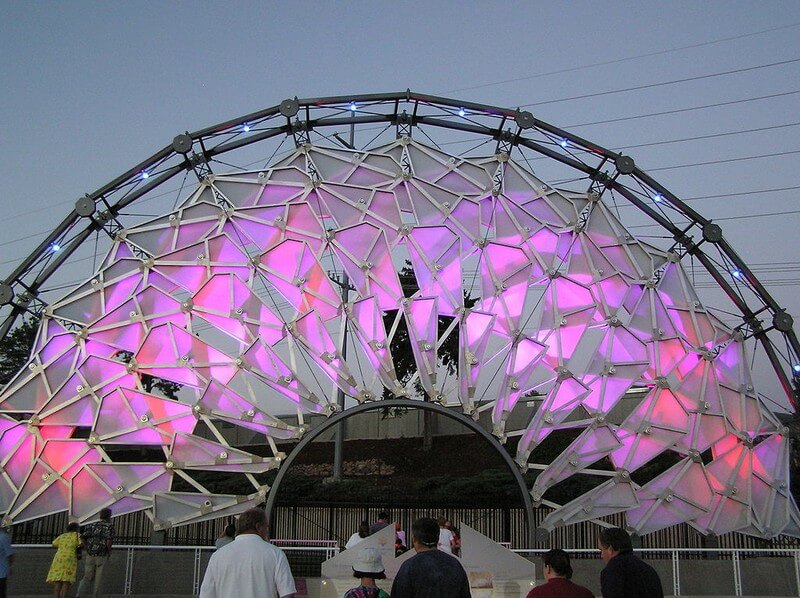 The arch was designed by Chuck Hoberman to be used as a mechanical curtain for the Olympic Medal Plaza's stage. It is a semi-circular aluminum structure, which opened like the iris of a human eye.