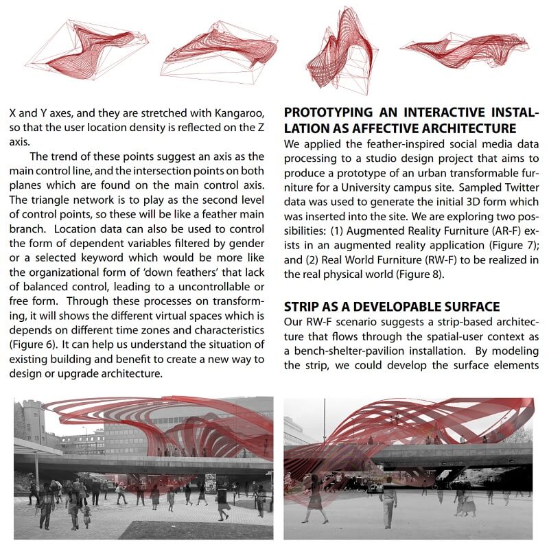 Authors explore how data processing of users’ expressions and sharing of moods/emotions through social media can become a source of influences on shaping the form and behaviour of interactive architecture.