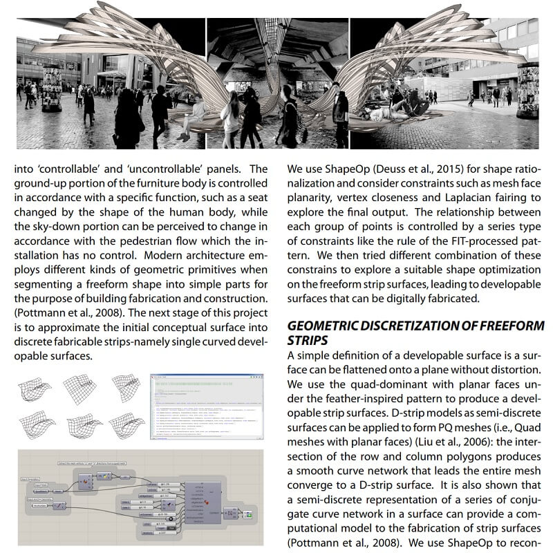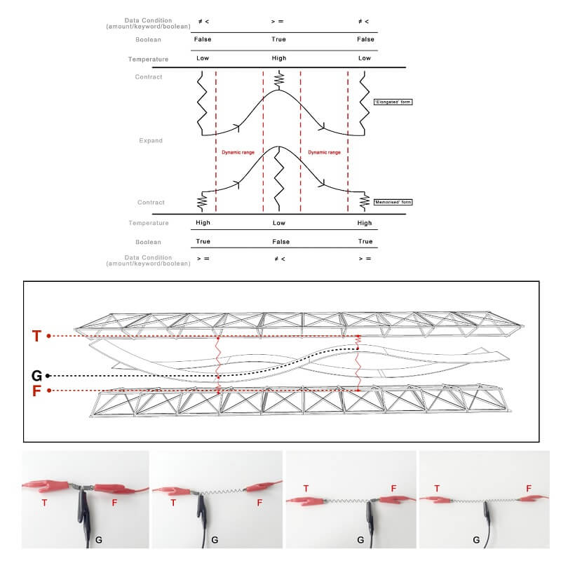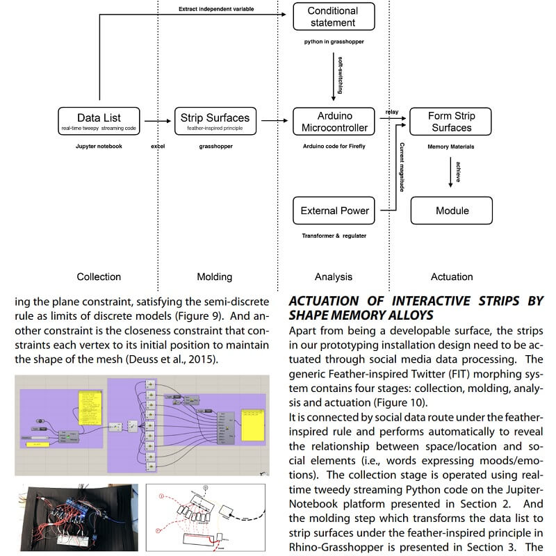 The interactive prototyping method includes (1) a feather-inspired data-to-shape rule system together with the ShapeOp Library for generating strips as developable surfaces, (2) a physical computing platform built with Arduino micro-processor and shape memory alloy springs for actuation, and (3) physical model-making.