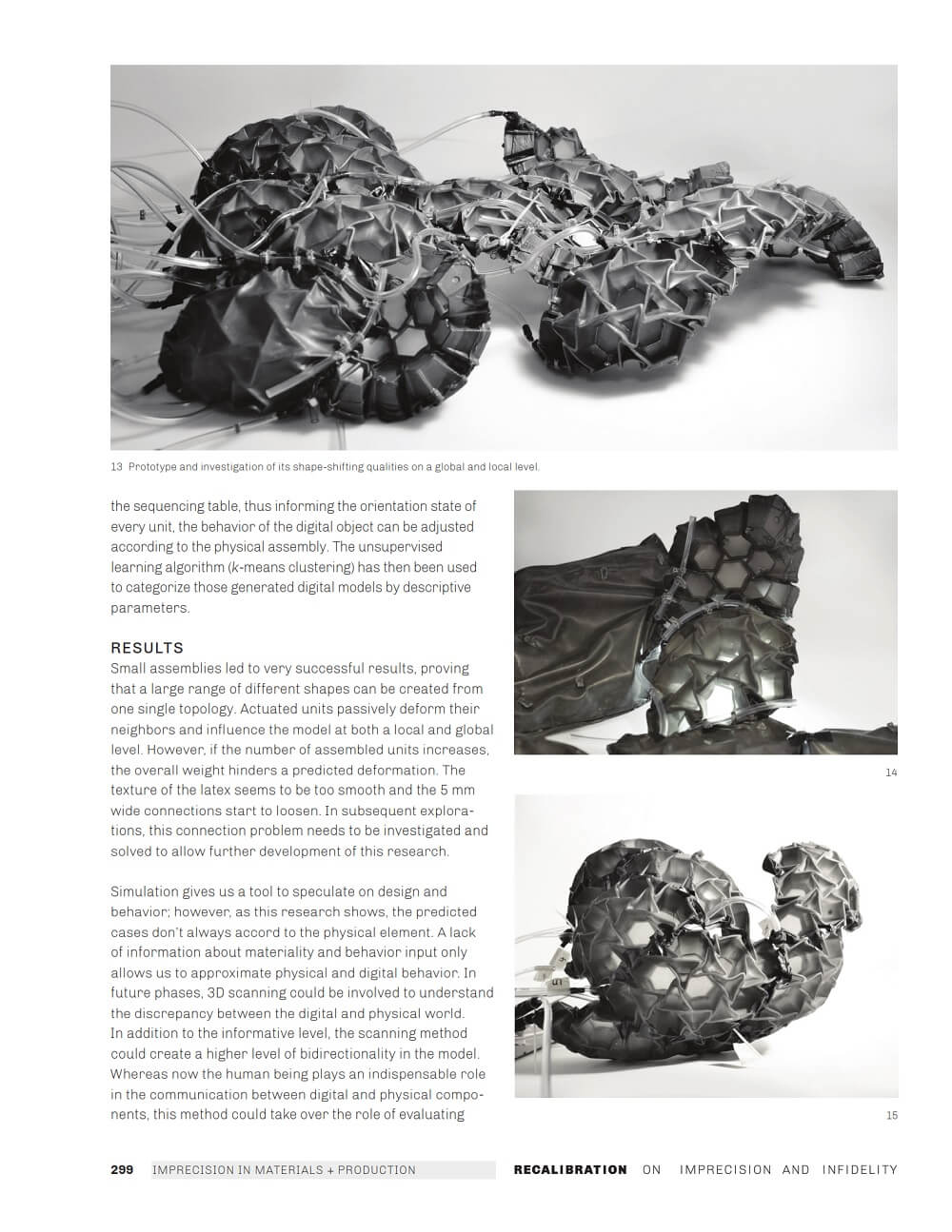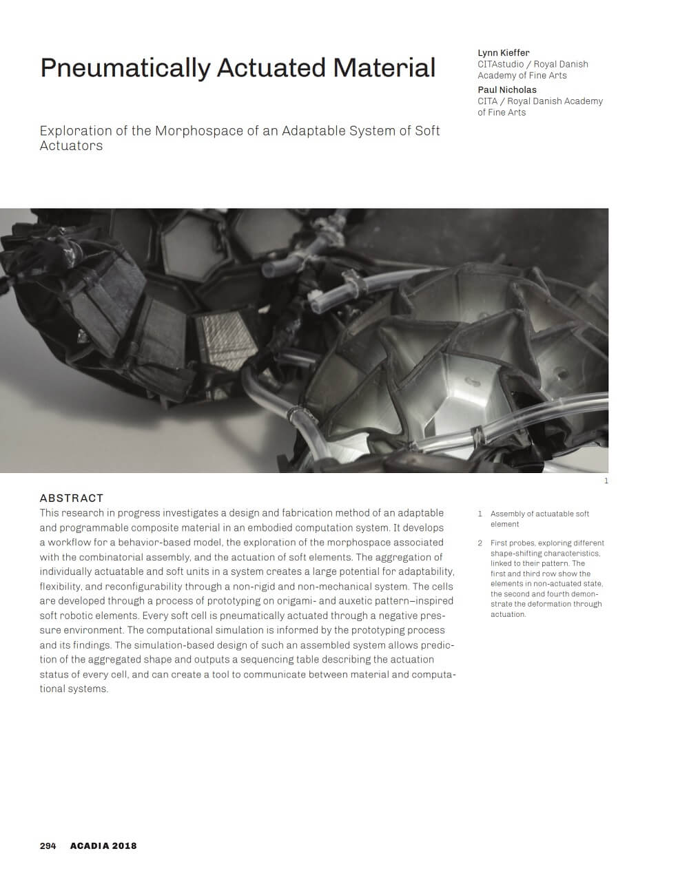 This research in progress by Lynn Kieffer and Paul Nicholas investigates a design and fabrication method of an adaptable and programmable composite material in an embodied computation system. It develops a workflow for a behavior-based model, the exploration of the morphospace associated with the combinatorial assembly and the actuation of soft elements. The aggregation of individually actuatable and soft units in a system creates a large potential regarding adaptability, flexibility and reconfigurability, through a non-rigid and non-mechanical system.