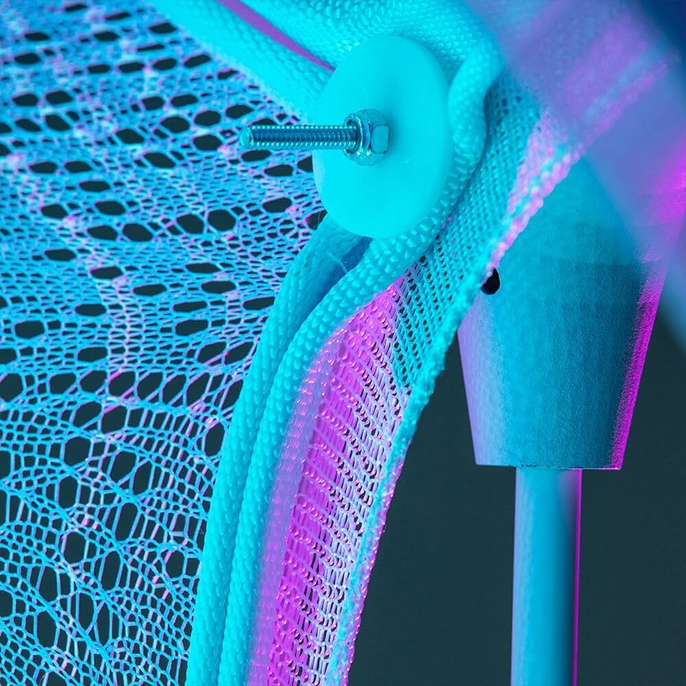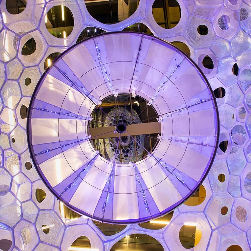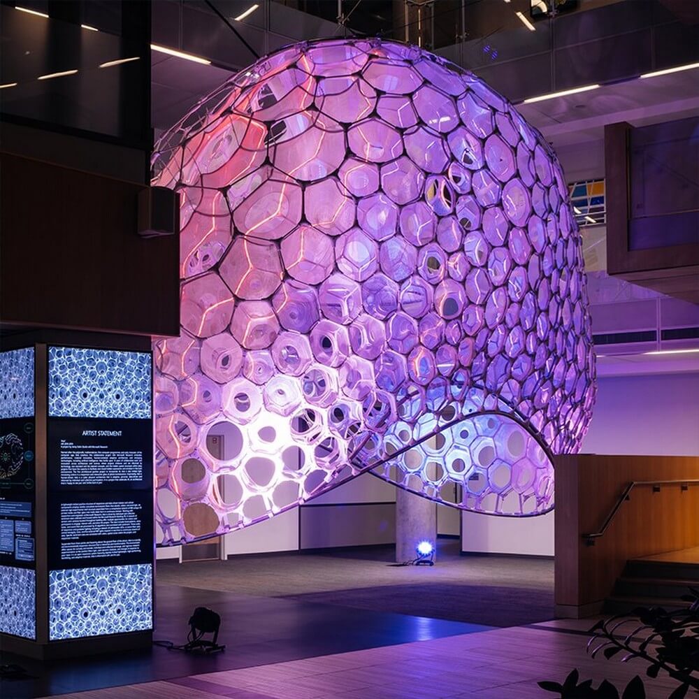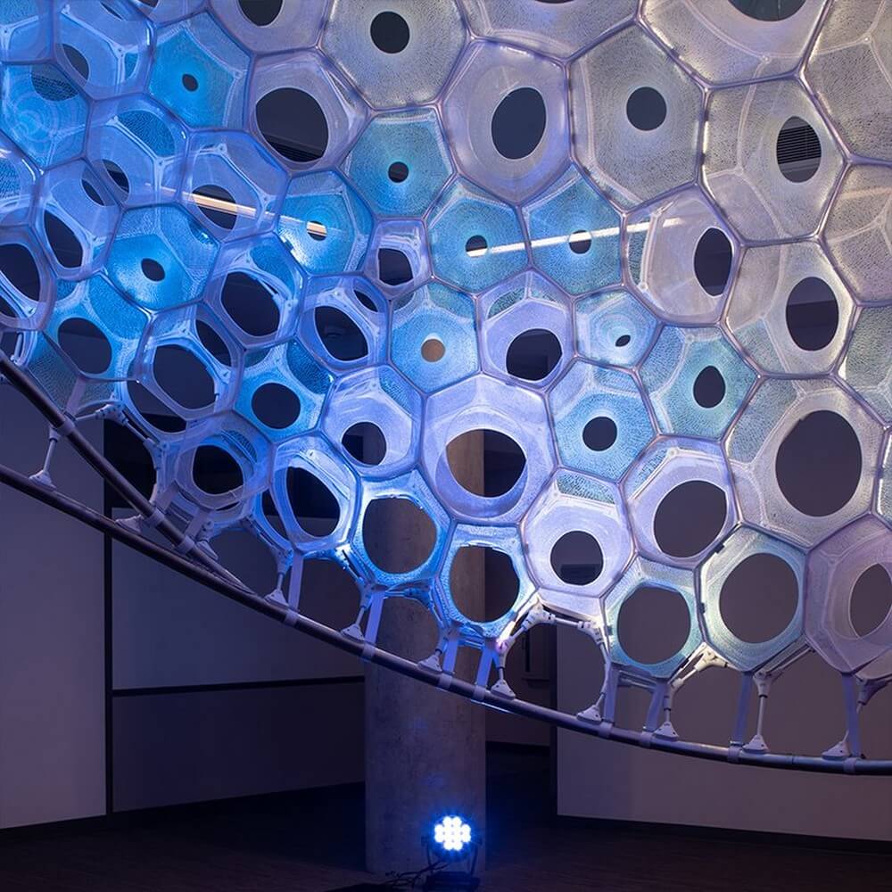 Ada builds upon 13 years of collaborative work and innovation across architecture and science. by embracing AI, the project investigates how hidden expressions and emotion in the built environment can be revealed through the use of technology. For sabin‘s work, the artist has formed a lightweight, knitted structure of responsive and data-driven tubular and cellular components that employs textiles and photo-luminescent fibers to absorb, collect, and emit light.