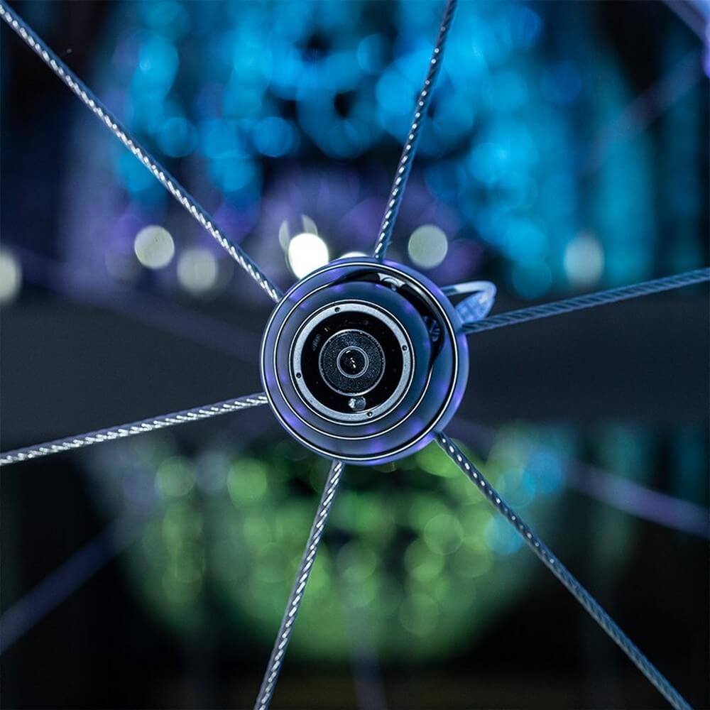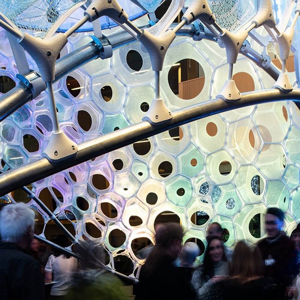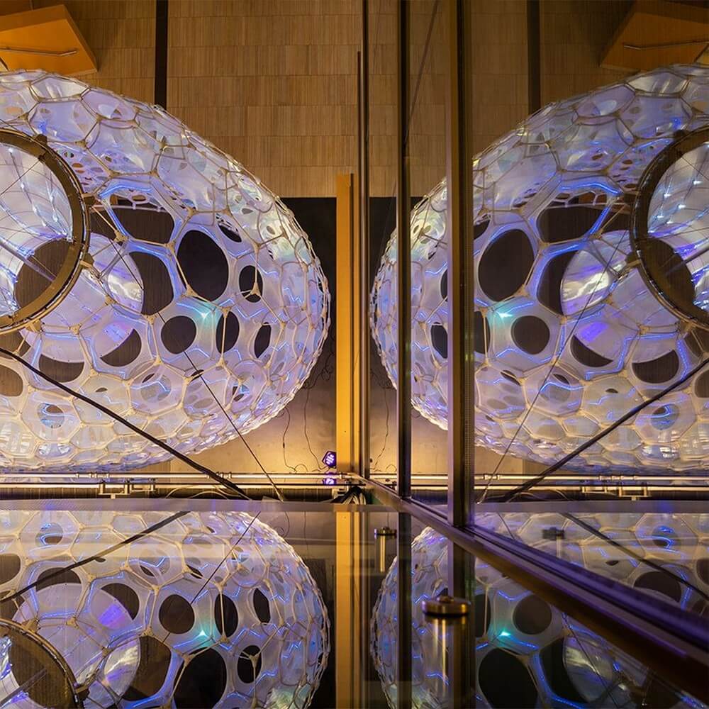 The external shell structure is assembled from a compressive network of 895 unique 3D printed nodes and fiber glass rods that holds ada’s form in continuous tension. three scales of responsive and gradated lighting including a network of addressable LEDs, a custom fiber optic central tensegrity cone, and five external par lights respond in real time to continuous streams of data. specific sentiment data are correlated with colors, spatial zones within the project, and responsive materials.