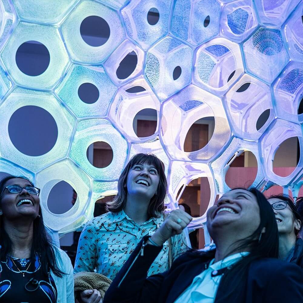 Informed by individual and collective participation, the structure reacts and changes to people’s varying facial expressions and tone of voice. Immersing visitors in a responsive and interactive glow of photo-luminescence, ada has been created as an architecture that is ‘happy to see you’ and ‘smiles back at you’.