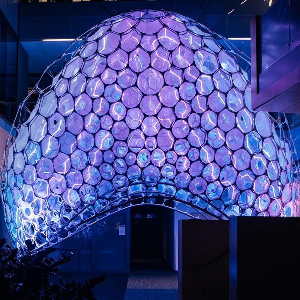 In collaboration with microsoft research, artist-in-residence jenny sabin has designed the ‘ada’ installation for the tech company’s redmond campus in washington. The work takes its name from ada lovelace, the english mathematician who is often credited as one of the first computer programmer. The architectural pavilion incorporates the use of AI to create a wholly immersive experience that transforms personal data into light and colors.