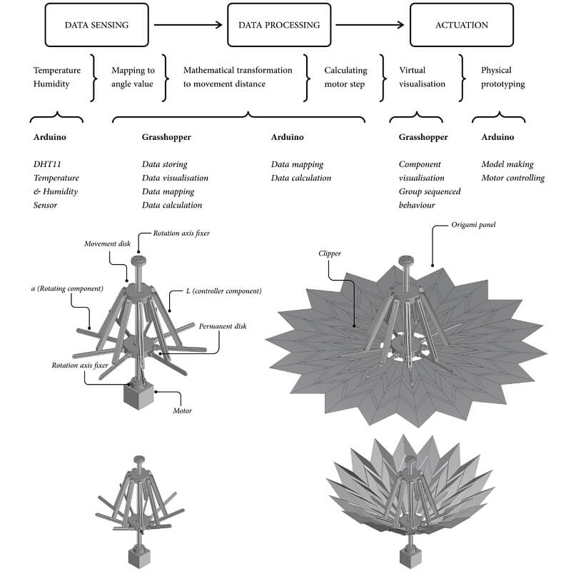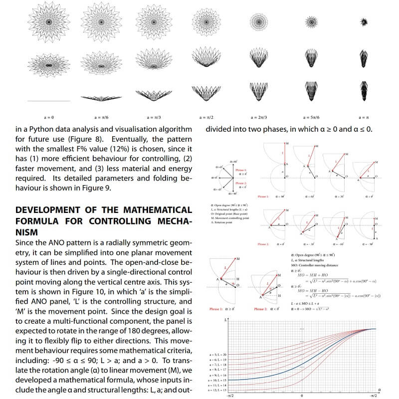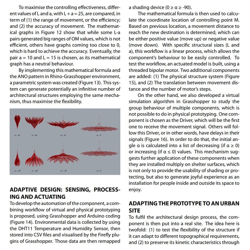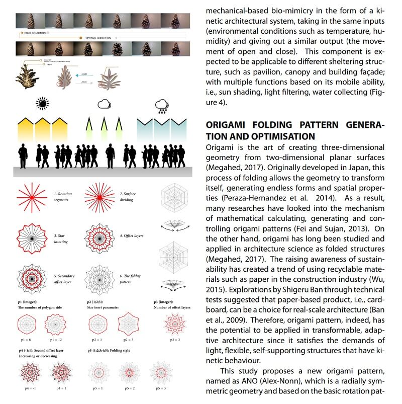 A flexible modular prototype system is developed and evaluated through combining origami-based fabrication simulation and mathematical characterisation mimicking the pinecone’s nastic movements. The modular design system is then applied to an urban site as a test case study.
