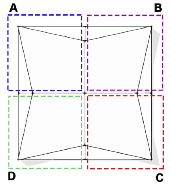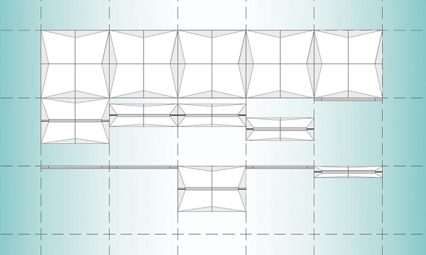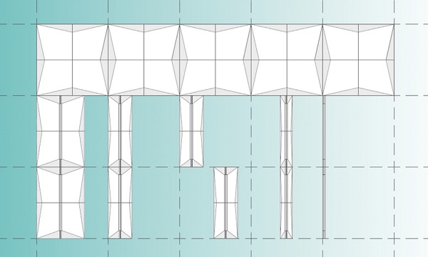 The basic module of the facade consists of four shading devices that can be folded along both horizontal and vertical axes. The design enables shading under both high and low sun angles, without blocking visibility to the outdoor environment.