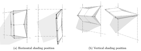 We mimic this property to develop the module that can vary its position according to the changing solar angles. The module can change from a fully opened position to a horizontal shading position or a vertical one.