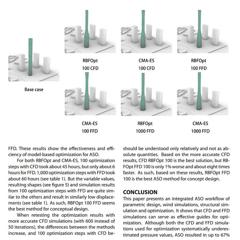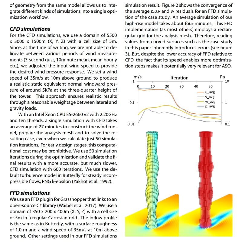 Using an integrated workflow with parametric design, Computational Fluid Dynamic (CFD) and Fast Fluid Dynamic (FFD) simulations, structural analysis and optimization, this paper by Ran Zhang, Christoph Waibel and Thomas Wortmann, evaluates the relative suitability of CFD and FFD simulations for Aerodynamic Shape Optimization (ASO).