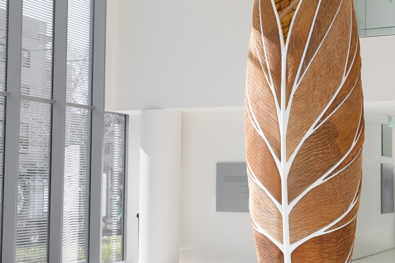 Continued research on the application of environmentally responsive biocomposites has led to the first architectural-scale iteration the Aguahoja series. Standing five meters tall, the structure’s skin is composed of a flexible biocomposite with functionally graded mechanical, chemical, and optical properties.