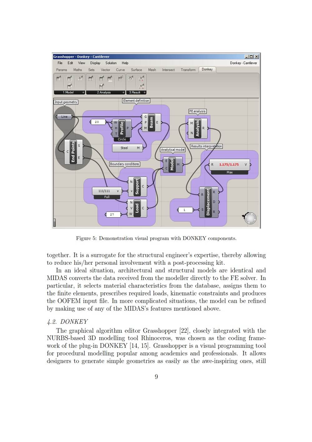 This paper by Ladislav Svoboda, Jan Novak, Lukas Kurilla and Jan Zeman presents a methodology and software tools for parametric design of complex architectural objects, called digital or algorithmic forms. In order to provide a flexible tool, the proposed design philosophy involves two open source utilities Donkey and MIDAS written in Grasshopper algorithm editor and C++, respectively, that are to be linked with a scripting-based architectural modellers Rhinoceros, IntelliCAD and the open source Finite Element solver OOFEM.