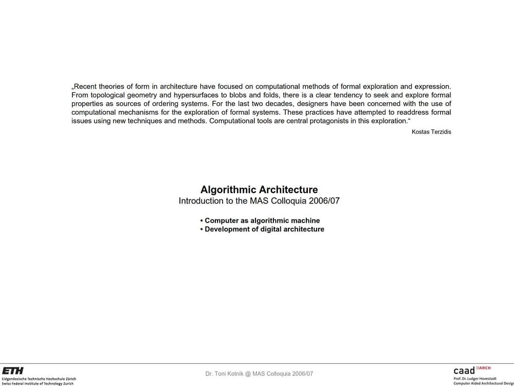 Algorithmic Architecture by Dr. Tony Kotnik discusses subjects like computational design and digital architecture. Recent theories of form in architecture have focused on computational methods of formal exploration and expression. From topological geometry and hypersurfaces to blobs and folds, there is a clear tendency to seek and explore formal properties as sources of ordering systems.