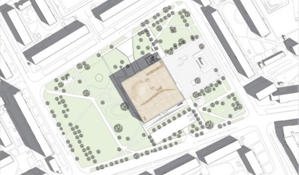 Surrounding of the square, where is located the museum, create rectangular blocks of flats. Architects, authors of the design, described their project as a compromise between rather simple form of buildings which are situated around the square, the green open area of park and the expressive power of the monument of the heroes of the ghetto.