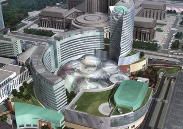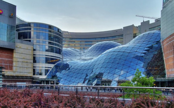The commercial complex “Złote Tarasy“ was realized in 2002-2006 in a central part of Warsaw at Plater Street. The building is located near the Central Station in Warsaw. The American architect David Rogers from The Jerde Partnership – the international design office, designed the building. According to his description of the design the most important and interesting part of the complex should be the courtyard. This part of the complex should be like the urban quarter, a shopping arcade.