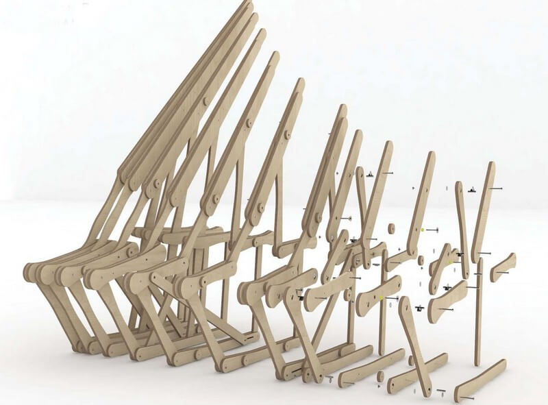 Consisting of 1,752 components, the pavilion changes its form throughout the sections, capturing the various human positions from seating to lounge position. The pavilion is designed to respond to the subtle ergonomic movement of the body through an innovative joint system which uses industrial rubber within the joint to act as a buffer. This allows the joint to bounce back and react to the user’s weight.