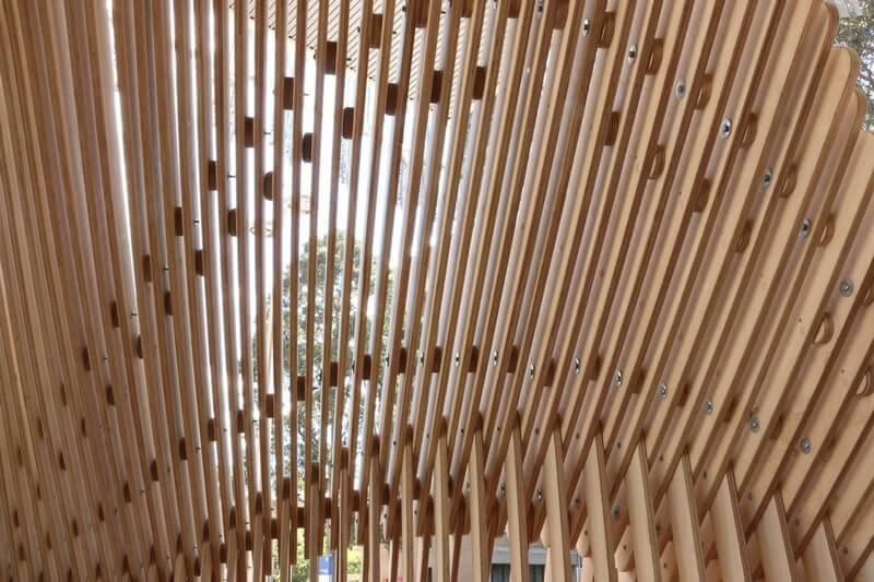 Articulated Timber Ground is a public pavilion designed and built by a group of Master in Architecture students at the University of Melbourne, Australia. The studio is led by Paul Loh and David Leggett (Power to Make). The pavilion is located next to the newly completed Melbourne School of Design by John Wardle Architects and NADAAA.