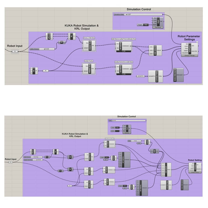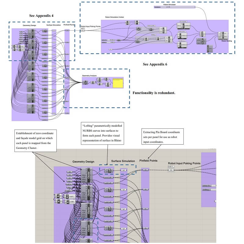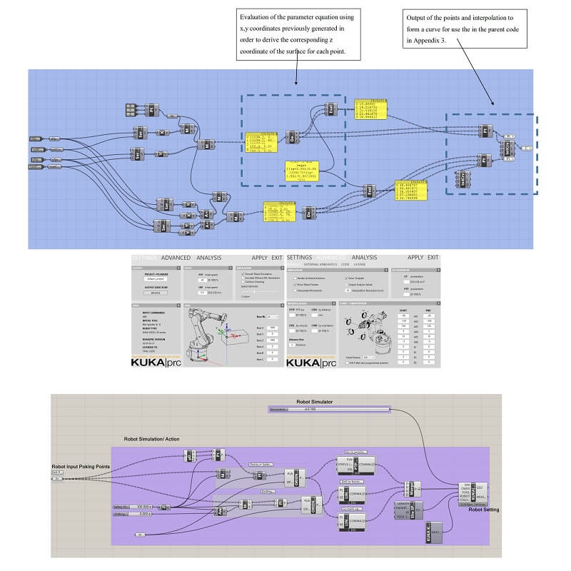 A digital algorithm models a double curved test façade, subdivides it into manageable panels based on the dimensional parameters of the mold, creates a robotic toolpath simulation to map the surface geometry and generates the required machine-driving code.