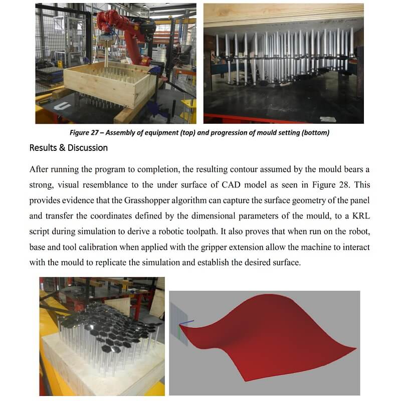 Detailed within this paper by Judah Hook, is the investigation and development of an alternative fabrication concept that utilises an inexpensive, reusable “pin board” mold that is autonomously set to various CAD derived surface geometries by a 6-axis robotic arm manipulator.