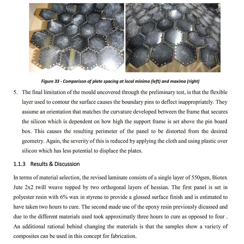 Under its design intent conditions, the set mold was used to fabricate samples of the digitally designed panels out of composite materials to assess the concepts strengths and weaknesses. This resulted in geometries that adequately resembled the curvature of the CAD model, however preliminary samples exhibited considerable surface and structural defects.