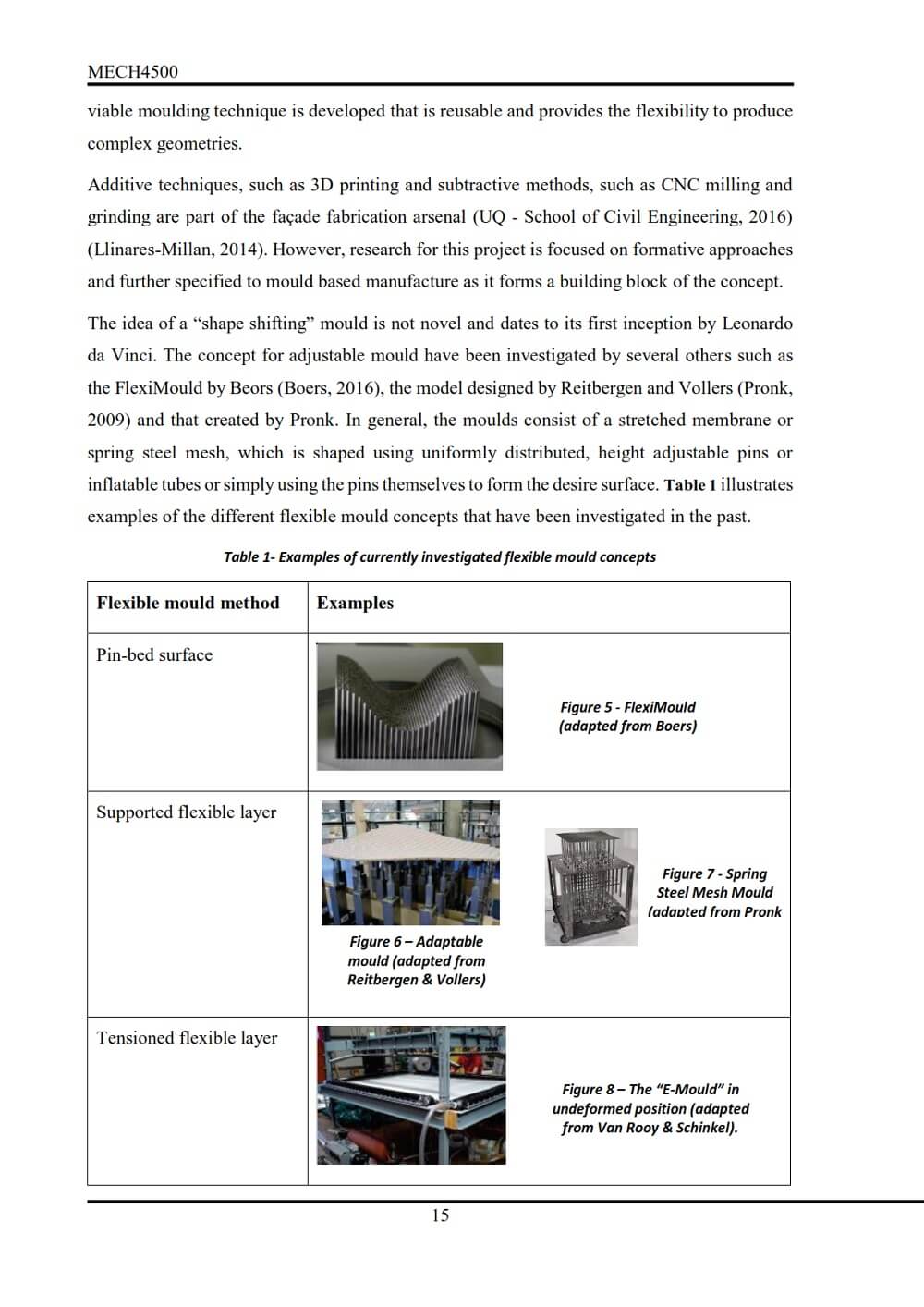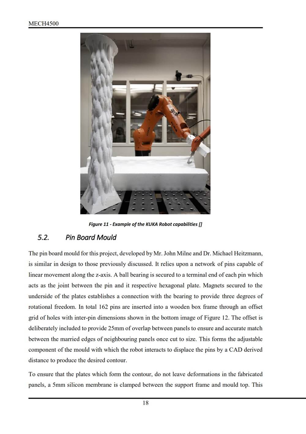Within this thesis by Judah Hook is the investigation and development of an alternative fabrication concept that utilises an inexpensive, reusable “pin board” mould that is autonomously set to various CAD derived surface geometries by a 6-axis robotic arm manipulator. A digital algorithm models a double curved test façade, subdivides it into manageable panels based on the dimensional parameters of the mould, creates a robotic toolpath simulation to map the surface geometry and generates the required machine-driving code.