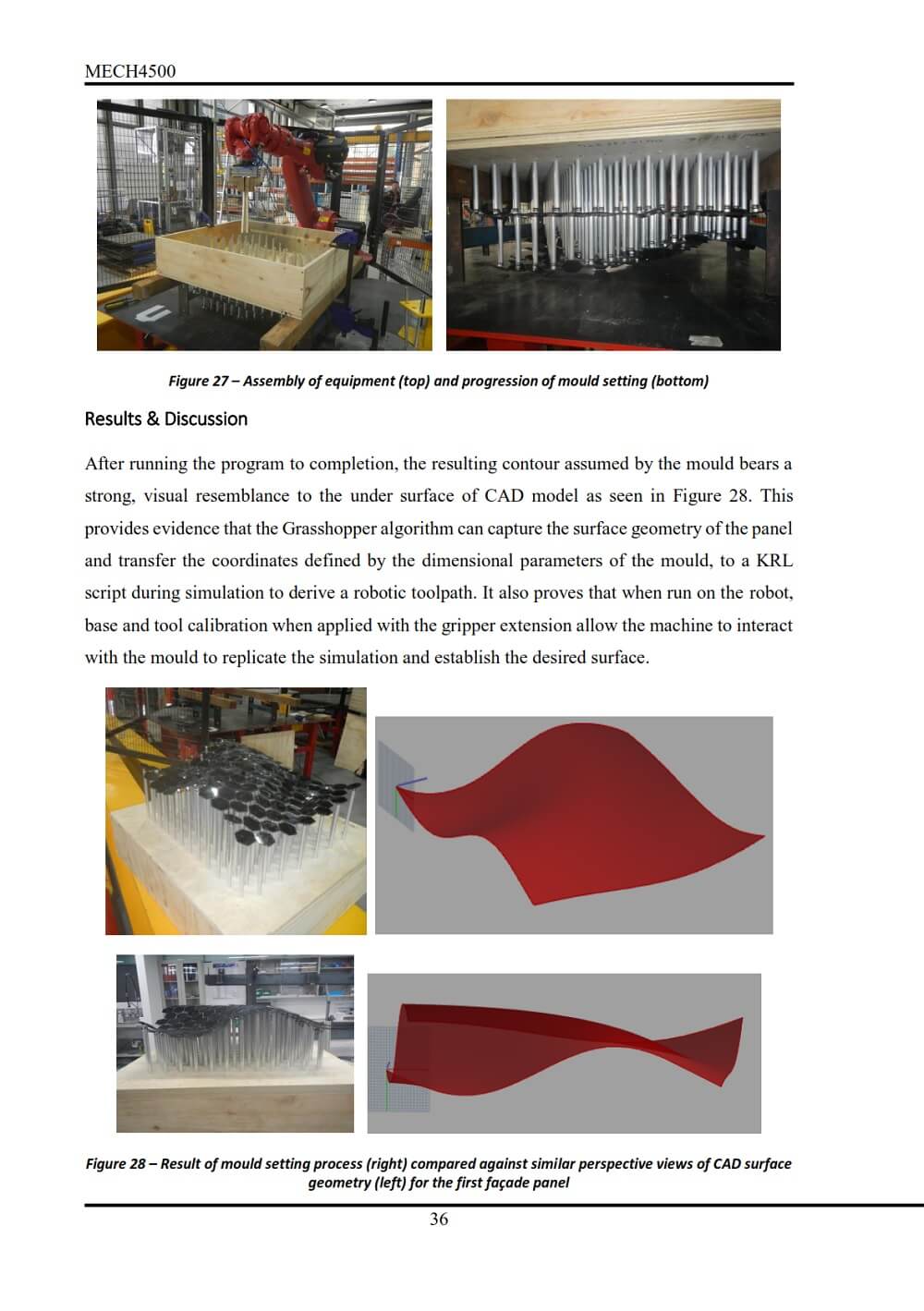 Active trails successfully set the pins of the mould to within 0.6mm of the analytically predicted coordinate. At fully operational speeds, this process is estimated to take less than 2 minutes. To establish a proof of concept, automated setting of the mould was conducted for two neighbouring panels of the façade with unique but respective geometries. Under its design intent conditions, the set mould was used to fabricate samples of the digitally designed panels out of composite materials to assess the concepts strengths and weaknesses. This resulted in geometries that adequately resembled the curvature of the CAD model, however preliminary samples exhibited considerable surface and structural defects.