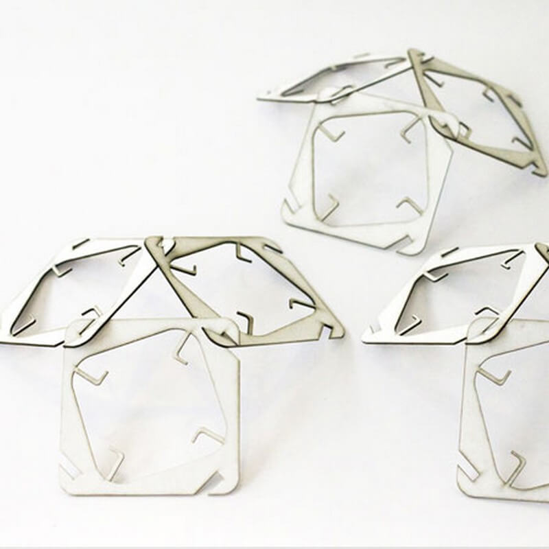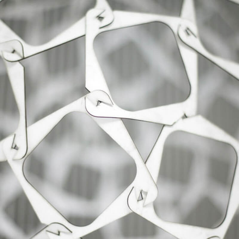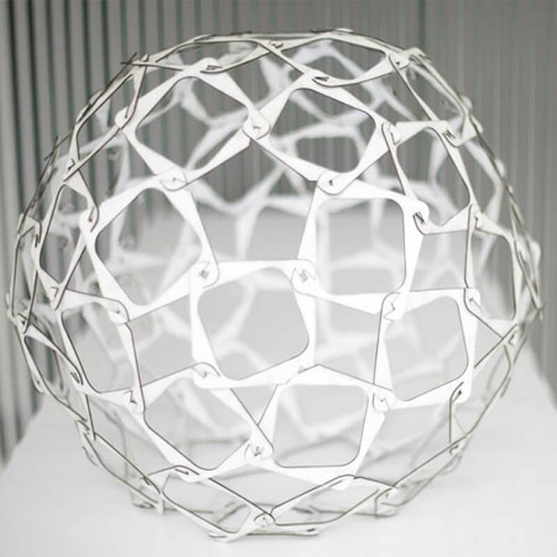 Lining Yao is a Masters student and research assistant in the Tangible Media Group at the MIT Media Lab who designed and fabricated parametric installations. The ball is made of 60 pieces of squares. All the squares have the same size and cut. A cut is made in each corner to join the two corners from two connected squares. She made this design based on Yoshinobu Miyamoto’s explanation about icosahedron.