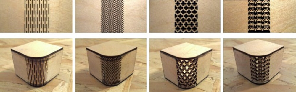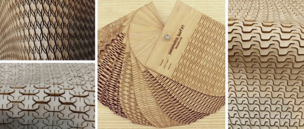 Living hinges work by exploiting the natural tendency for materials to flex around an array of cuts or notches. As we will see, it is possible to achieve this effect with quite a diverse visual impact; as the core concept of strategically placed cuts can still be achieved using many design variations. In the following test cuts by Martin Breuer, different patterns were evaluated for their pliability and strength across several criteria.