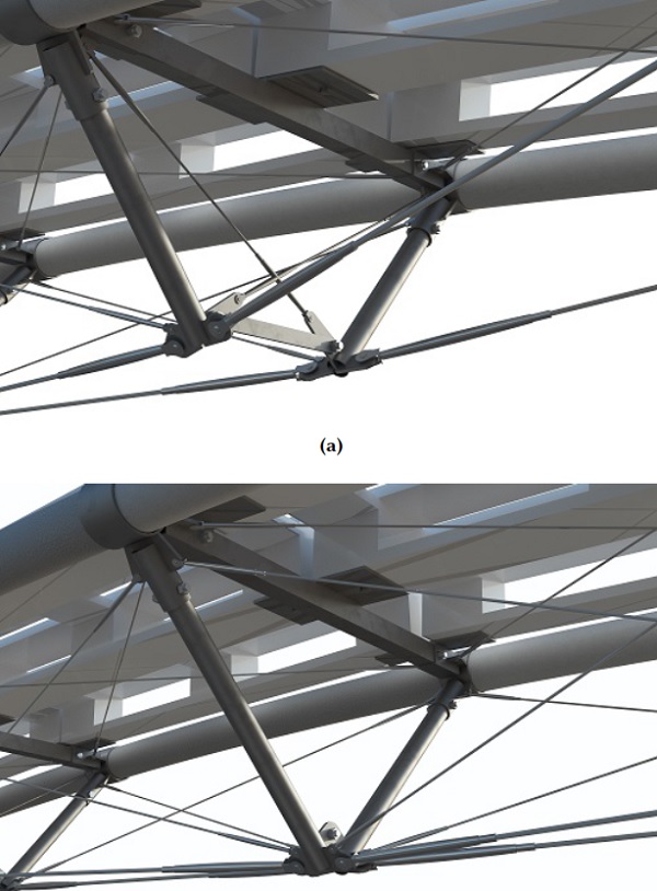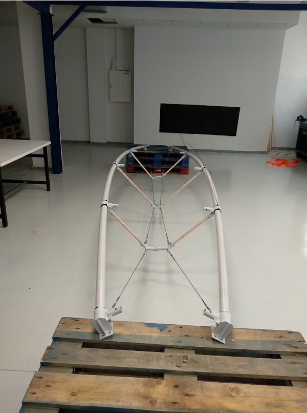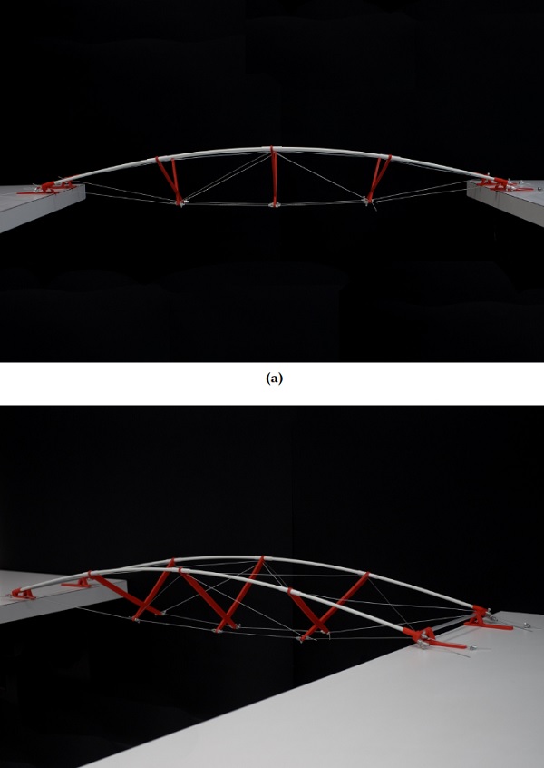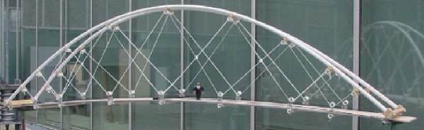This is a simple planar arch composed of a continuous flexible member that is activated by the action of main cables pulling at both ends of the rod, and secondary struts or cables that deviate the main cable and act at certain cross-section of the rod.