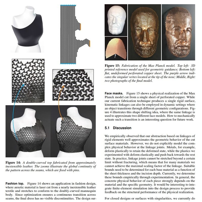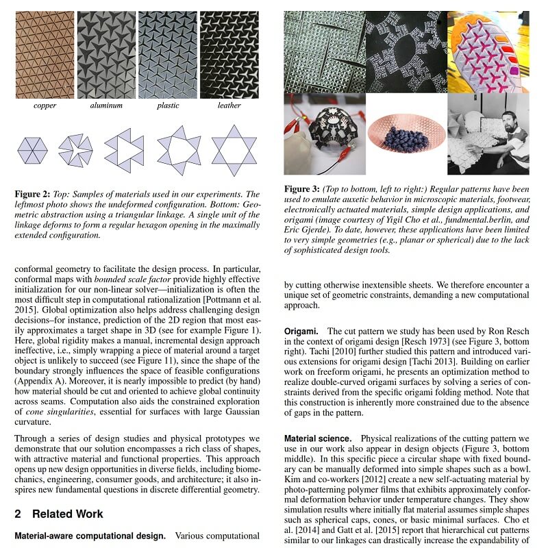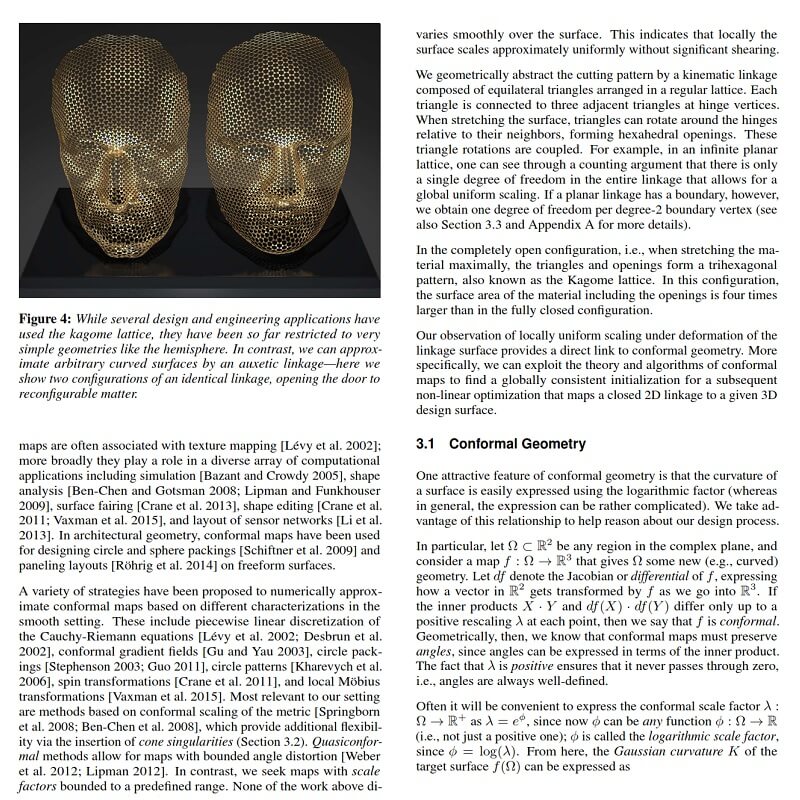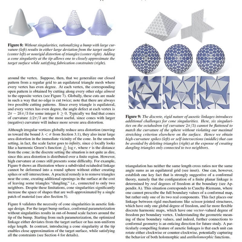 Authors present a computational method for interactive 3D design and rationalization of surfaces via auxetic materials, i.e., flat flexible material that can stretch uniformly up to a certain extent. A key motivation for studying such material is that one can approximate doubly-curved surfaces (such as the sphere) using only flat pieces, making it attractive for fabrication.