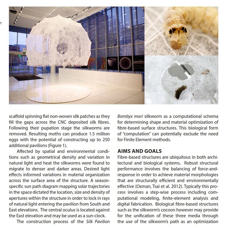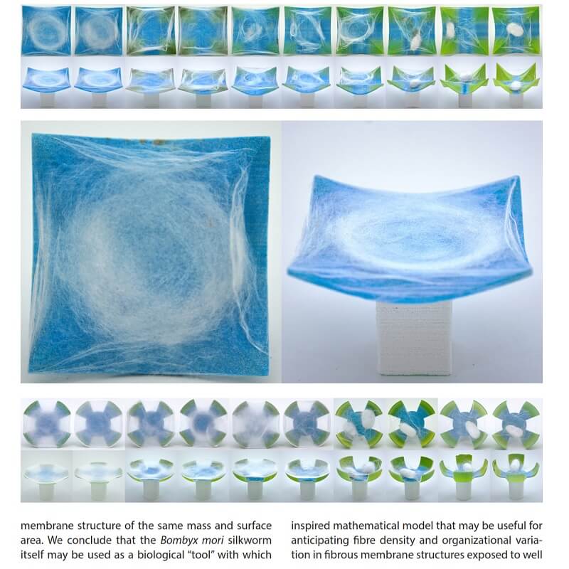 Biological case studies are presented and a design approach for the use of silkworms as entities that can “compute” fibrous material organization is given in the context of an architectural design installation. Authors demonstrate that in the absence of vertical axes the silkworm can spin flat silk patches of variable shape and density.