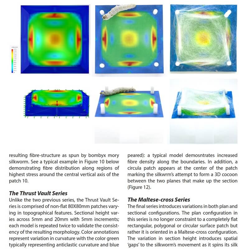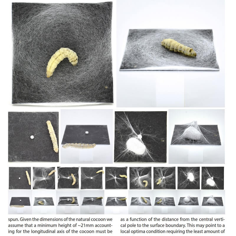 Biological case studies are presented and a design approach for the use of silkworms as entities that can “compute” fibrous material organization is given in the context of an architectural design installation. Authors demonstrate that in the absence of vertical axes the silkworm can spin flat silk patches of variable shape and density.