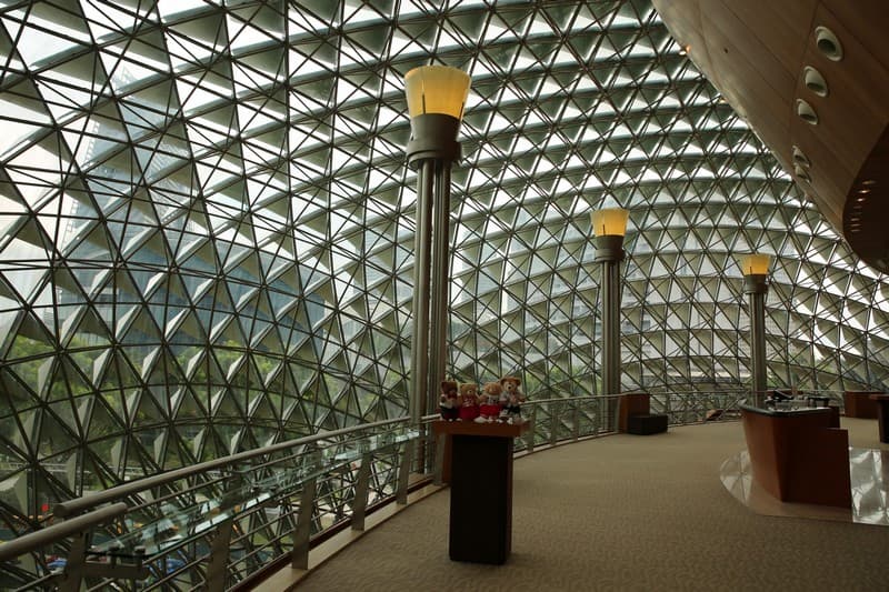 “A secondary sun shading lattice is used with folded sunshades which gradually transform in shape and orientation. The resulting dynamic and ever-changing mesh of dappled sunlight and shadows have given this world-class performing arts venue its distinctively Singaporean personality.”