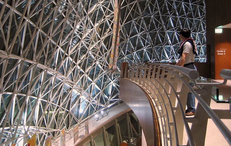 Inspired by the durian fruit with its formidable thorn-covered husk to protect the seeds inside, a cladding system consisting of lightweight, curved steel space frames with triangular aluminum sun shields were designed.3 The local sun path was extensively studied which showed that it is almost exactly east-west, and this, in turn, determined the shape and depth of the sunshade louvers. Complex geometry analysis via computer modeling then calibrated the shields to change their shape and orientation depending on the angle the sun hits them throughout the day.