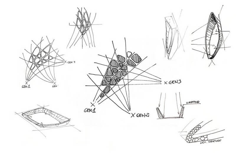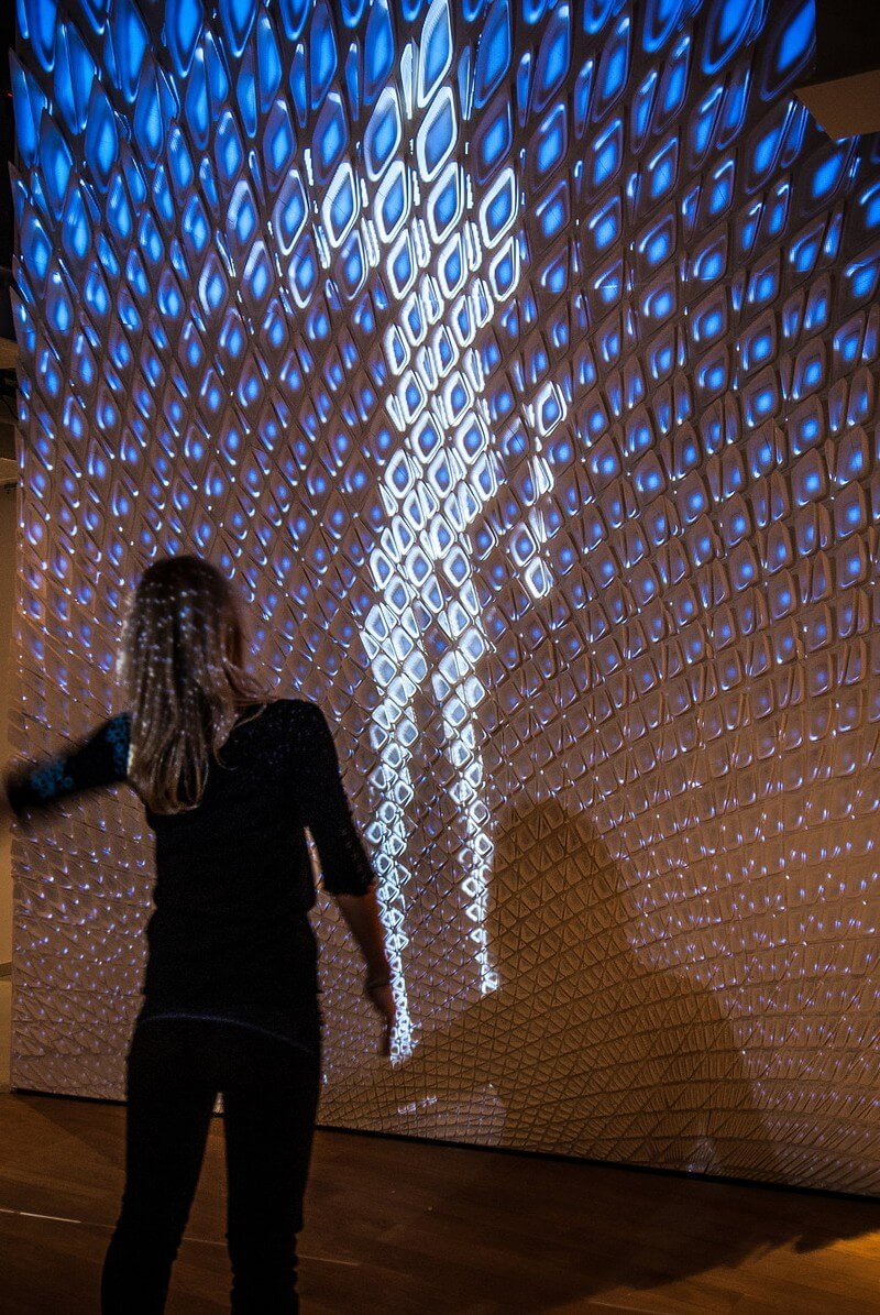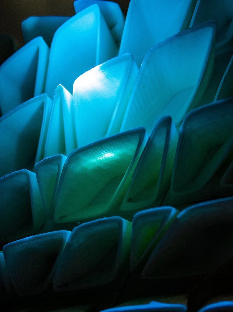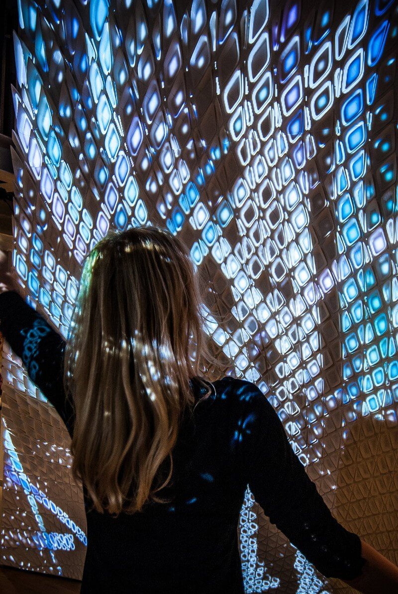 Designers have developed a custom algorithm with Rhino Grasshopper which allowed them to design complex geometry fulfilling multiple criteria at once. The criteria range from aesthetics through video mapping and 3D printing requirements. They decided to use 3D printing to build the installation because it provides high precision. Direct correspondence between physical realization and digital model was crucial for interactive mapping to work on such complex structure.