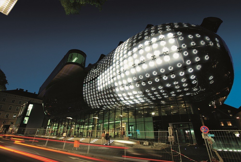 Affectionately named The Friendly Alien, by its designers Peter Cook and Colin Fournier, the Knusthaus Graz was built for the European Cultural Capital 2003 activities in Graz, Austria. Since the time of its construction, the biomorphous building has become a main attraction for art lovers and the culturally minded from all over the world, while also becoming an essential landmark in the urban identity of the city of Graz. This project demonstrates an impressive synthesis of innovative design language with the historic setting of the urban district along the Mur.