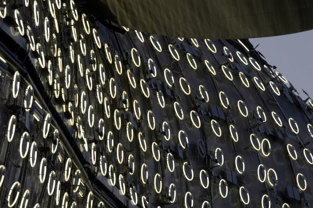 BIX consists of a matrix of 930 conventional circular fluorescent light tubes integrated into 900 square meters of the Plexiglas façade on the east side of the Kunsthaus. The individual, continuous adjustability of the lamps’ brightness with a frequency of 18 frames per second makes it possible to display images, films, and animations.