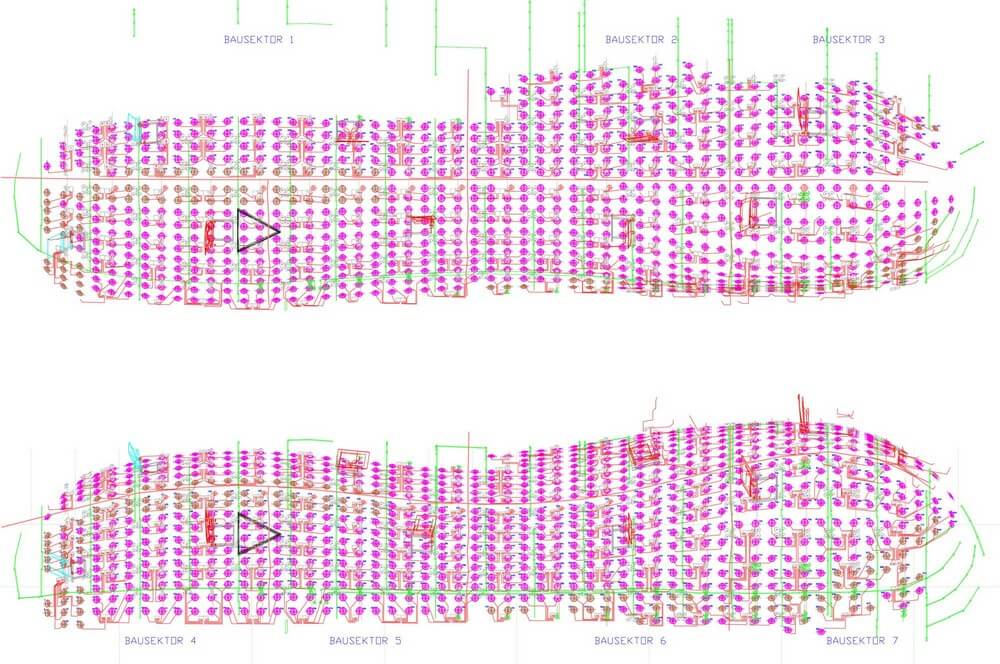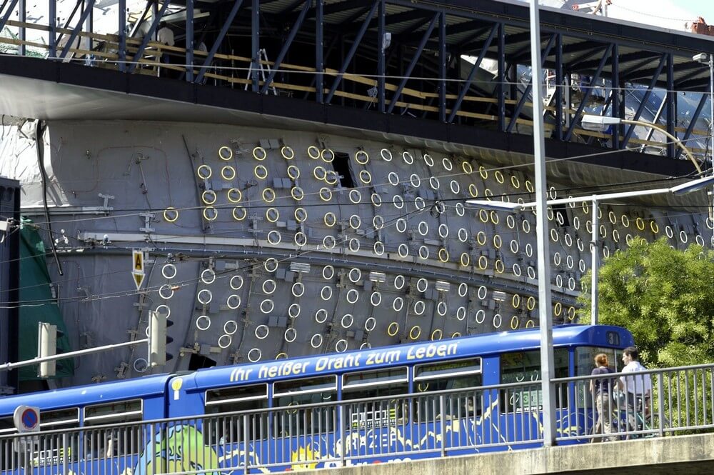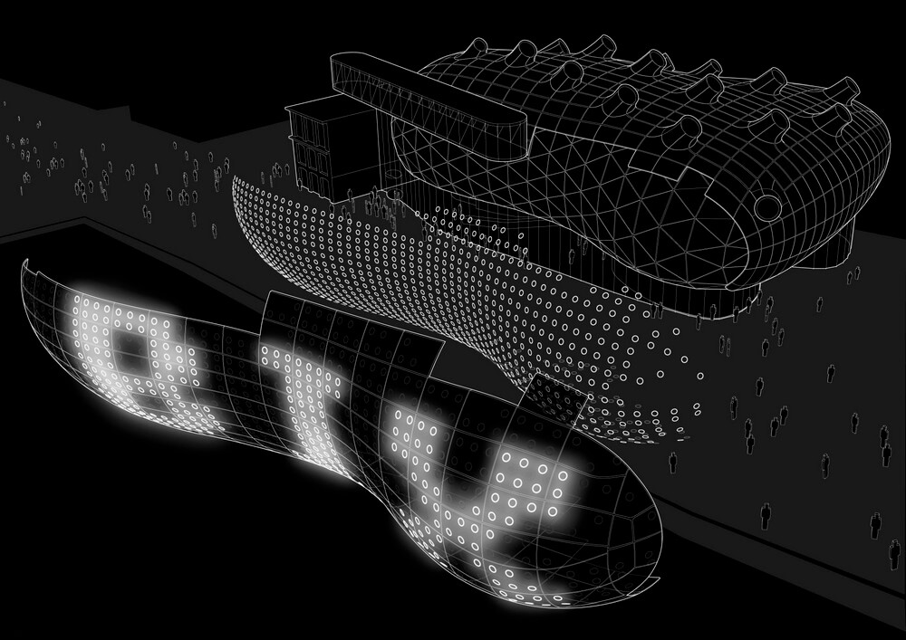 It received approval from the client and the architects because it was based on the architect’s original ideas for the sleek, blue, shimmering façade: Constructed from about 1,300 individually shaped, translucent Plexiglas panels covering the biomorphic building, the so-called skin was intended to feature different nuances of transparency, which would have created varying communicative relationships between interior and exterior. For both technical and budgetary reasons, the skin’s physical transparency had to be abandoned, degrading the material’s transparency into mere decoration.