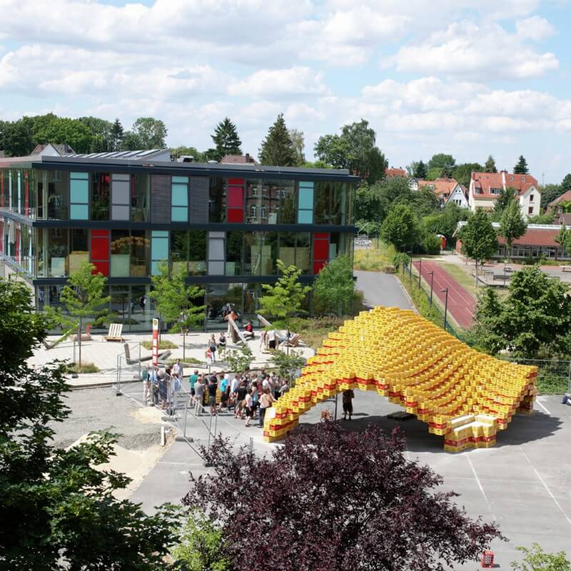 The experimental pavilion BOXEL was designed and realized by students of the architecture department during the last summer semester on the campus of the University of Applied Sciences in Detmold. The expressive design by Henri Schweynoch, which succeeded in an impromptu competition, creates a generous spatial scenery for presentations, concerts, events and gatherings on the campus.