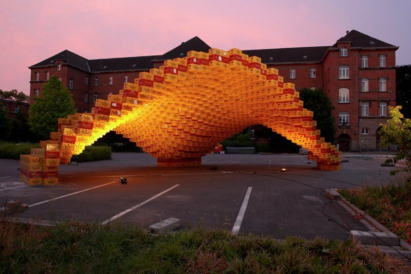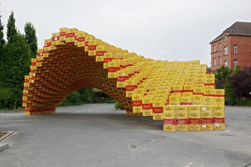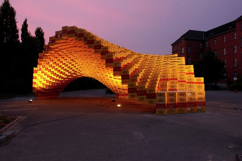 The building shape is based on a minimal surface and consists of more than 2.000 beer boxes that are organized along the free form geometry. The temporary construction was designed using parametric software to control the position of the boxes in relation to the overall geometry and to analyze the structural performance.