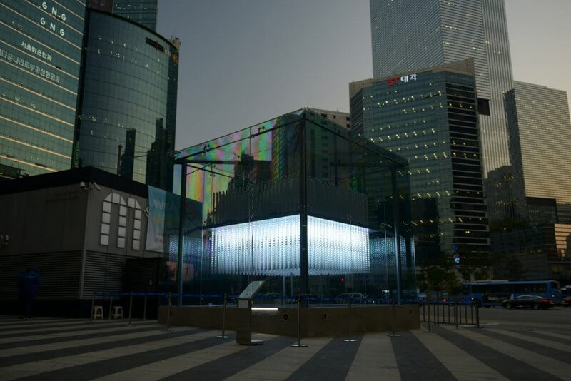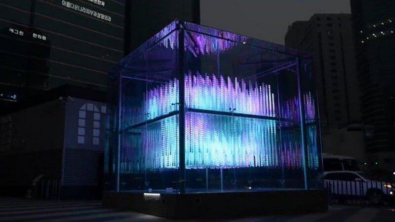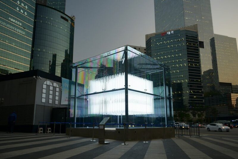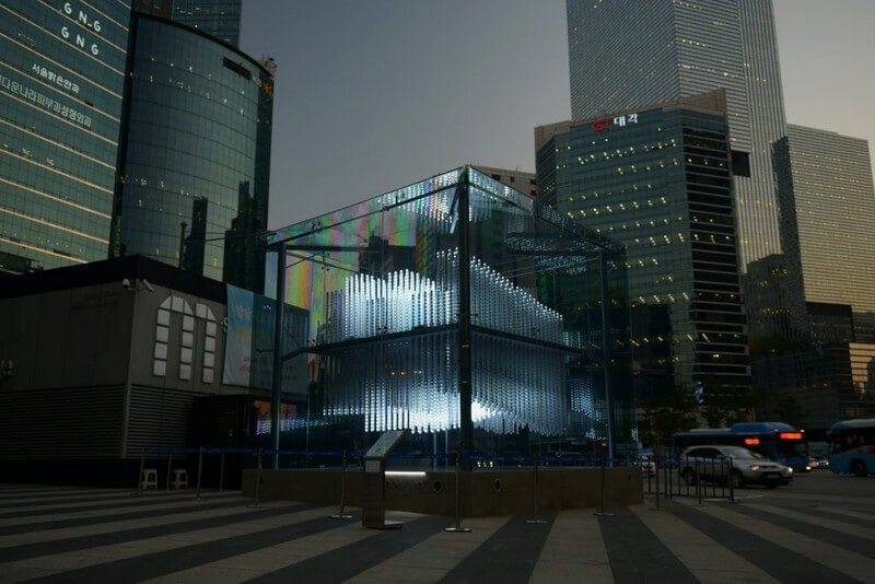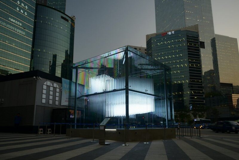 Brilliant Cube by Media Artist Group: Jonpasang is a kinetic 3D matrix, comprised of 576 clear LED poles moving up and down. The dimension is 6M X 6M X 6M. It is located at Gangnam station crossroads, one of the most crowded spots in Seoul being a new landmark of Gangnam.