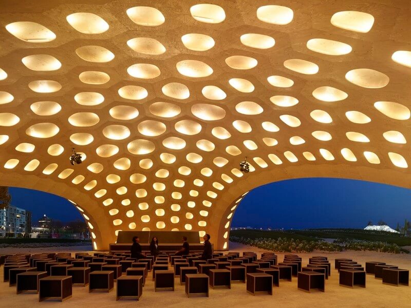 The BUGA Wood Pavilion celebrates a new approach to digital timber construction. Its segmented wood shell is based on biological principles found in the plate skeleton of sea urchins, which have been studied by the Institute for Computational Design and Construction (ICD) and the Institute for Building Structures and Structural Design (ITKE) at the University of Stuttgart for almost a decade.