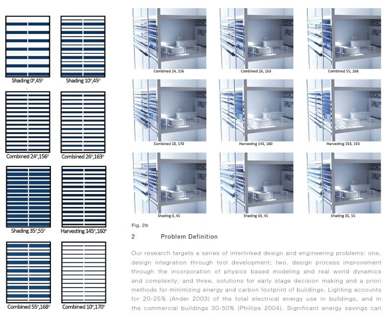 Specifically the tool enables design exploration of semiautonomous and fully autonomous configurations of an exterior building envelope louver system. The research situates itself in the field of intelligent building skins and adds to the existing solutions a validation of systems with interdependent louvers of varying tilt angles. The system is designed to respond to dynamic daylighting conditions and occupants’ preferences.