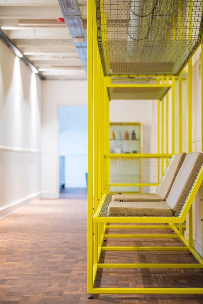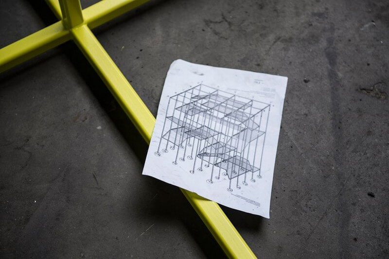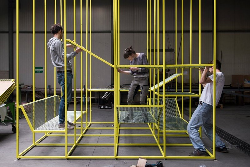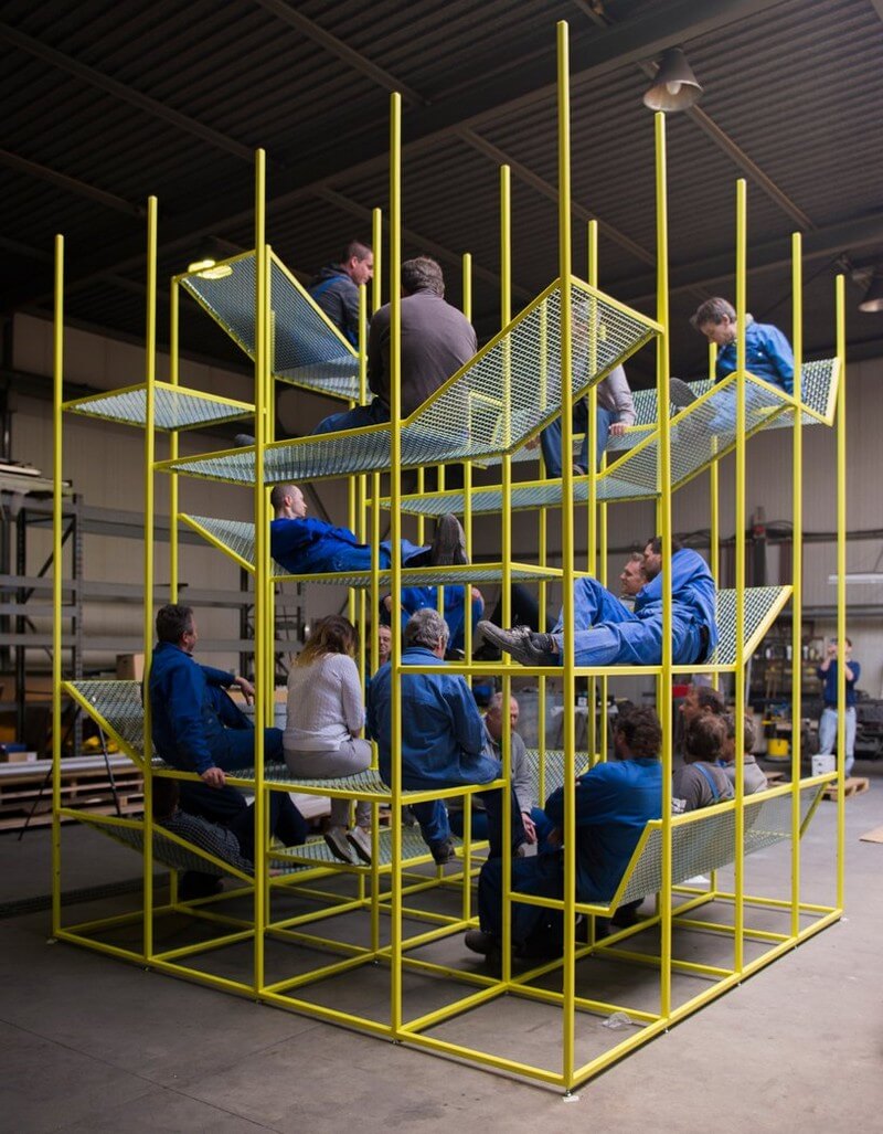 Its aim is it to elevate meetings and social interactions into a vertical office by encouraging users to interact with the structure and with one another. they can climb it, relax and meet in the elevated work-lounge space made from lacquered steel.