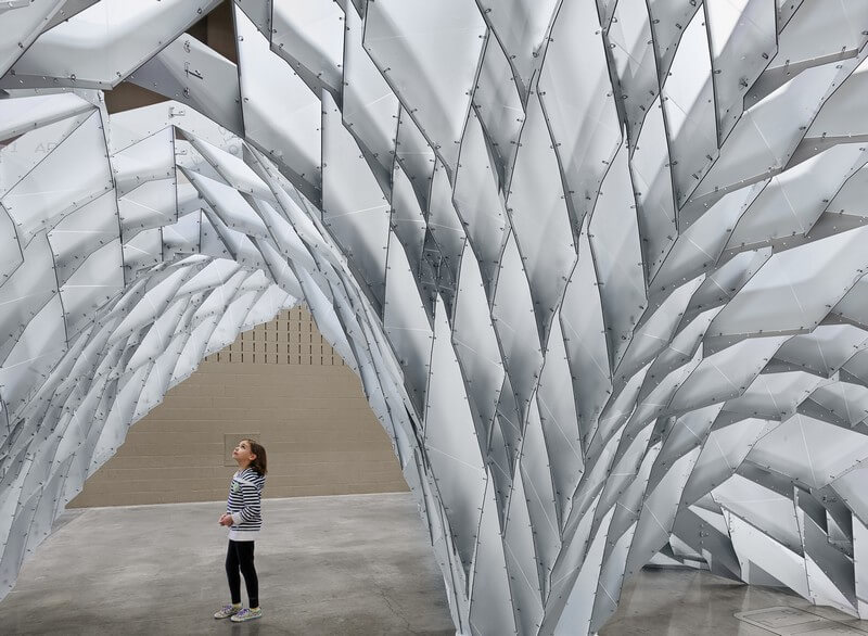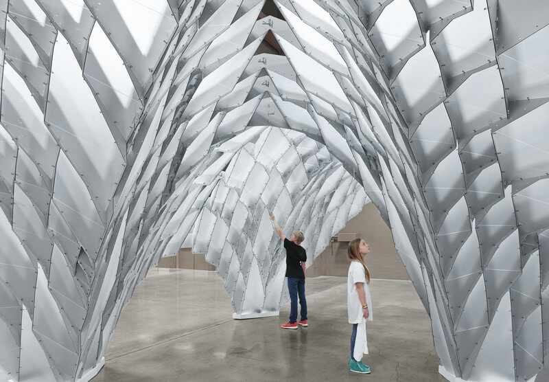 To enable a smooth transition from a flat, two-dimensional ground surface into a volumetric, three-dimensional vault, the studio used a diamond pattern that could work as both an aggregate and woven rib-system.